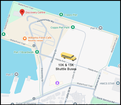 Shuttle buses will board 10K & 15K participants at Discovery Dr & Haida Ave (Hamilton Waterfront).